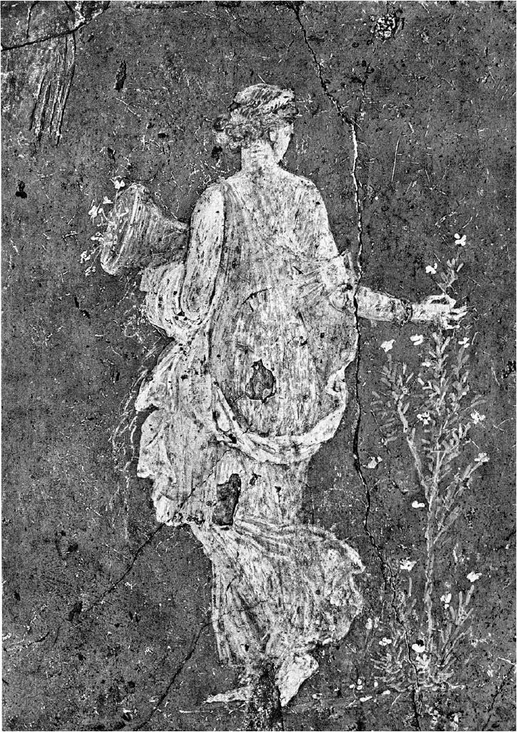 《采花的少女》是一幅优美无比的壁画。在这一依然可以看出希腊化影响的壁画里,人们感觉到的是一种极为抒情的自然主义。画中的少女款款走过,采花的动作优雅、妩媚。尽管人们无法看到她的美丽容貌,但是,背对的形象却会引发观者更为微妙的遐思。鲜花与少女几乎是无法分开的美的存在。确实,这样的描绘是一种对人物形象的内心世界的一种巧妙处理。
