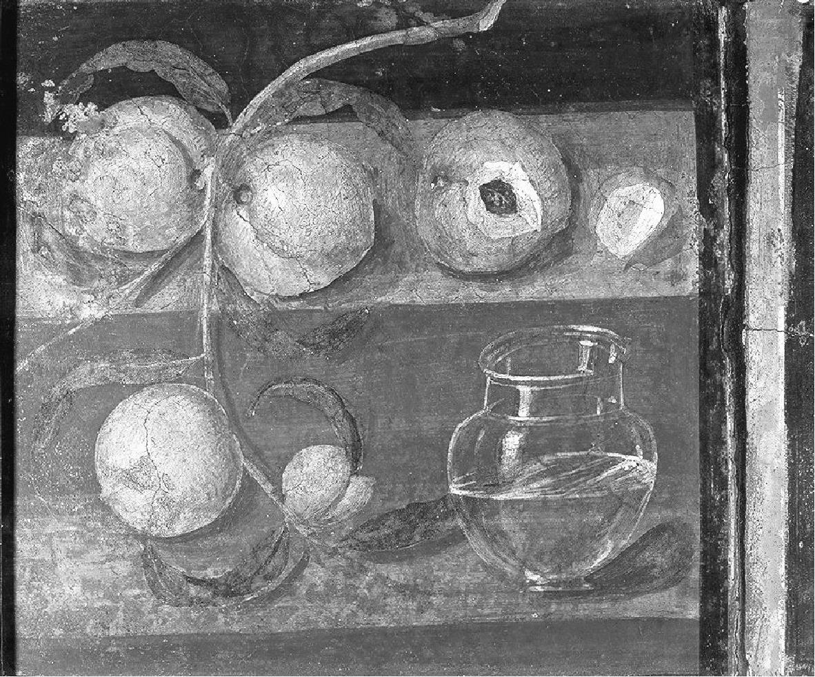 《有桃子的静物画》是一幅小的壁画作品。具有错觉效果的写实描绘达到了一种令人惊叹的高度。光影的投射(包括透过物体后的效果)、明暗的对比都似乎是无可挑剔的。玻璃水缸上的高光、水面的反光尤为精彩。此画是西方早期静物画的杰作。