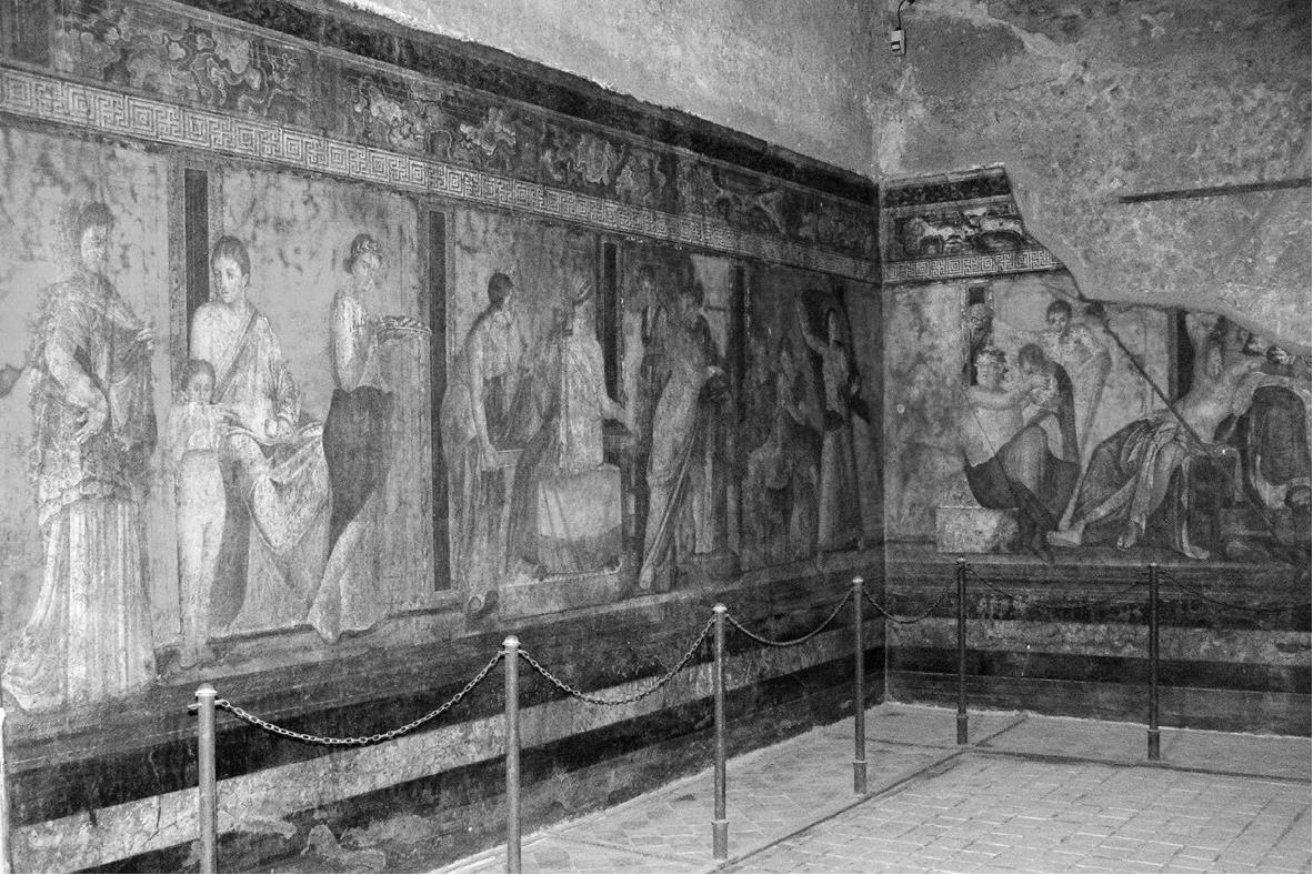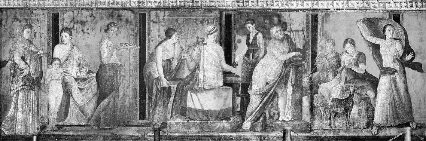 神秘别墅中的壁画是一个与祭拜酒神的仪式活动有关的场所。在暗红色的背景上,差不多真人大小的人物形象轮廓鲜明,色彩丰富,显得颇为突出。他们仿佛是在舞台上,其姿态可能借鉴了古希腊艺术,而圆润的躯体、优雅的体态和专注的表情都透发出强烈的戏剧性效果。