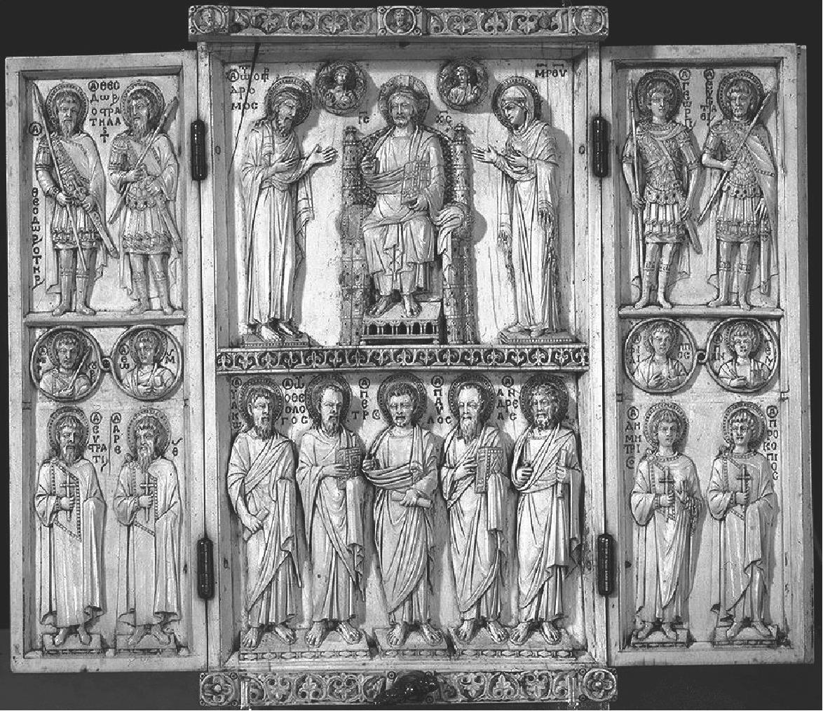 这里,我们只介绍两件作品。首先是一件祭祀用的小神龛,它可能是旅行时使用的物品。在上面一排的中间就是坐着的基督,右边是正在为了人类祈求神圣宽恕的圣母,而左边则是施洗约翰。下面一排中间的形象是五个使徒。人们不难见出雕刻者的精益求精和对人物的娴熟把握。人物旁边的说明文字正是当时通行的希腊文。