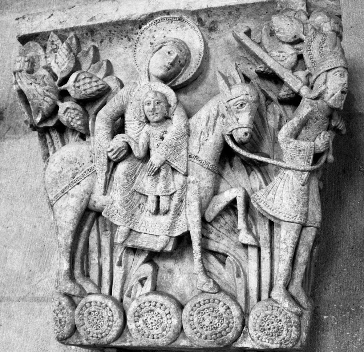 在这里,约瑟夫牵着一头驴走在前面,驴背上是圣母和圣婴。约瑟夫衣服下摆向后翘起,好像突然有风吹来。整个作品反映出罗马式雕塑所孜孜以求的那种优雅构成的特点。圆形与弧线的反复,增添了整个雕像的设计感。装饰性的植物成为背景,具有图案性的圆形是雕像的支撑物。不过,圣婴坐在圣母身上交代得并不理想,他仿佛是没有重量似的存在。对地心引力的忽略或许是许多罗马式雕塑的一种通病。