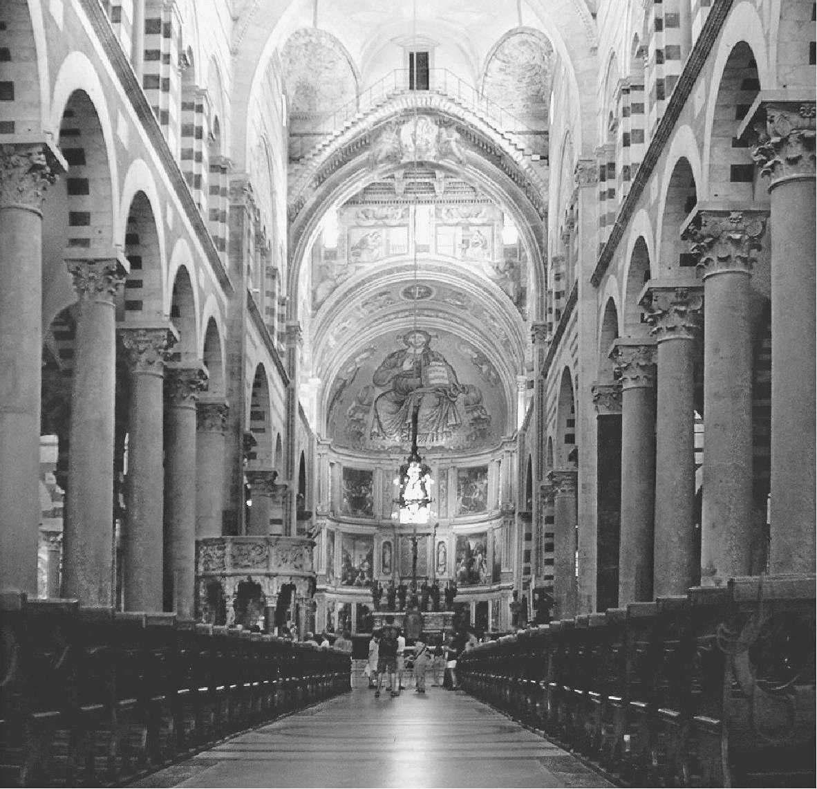 比萨大教堂可谓罗马式建筑的一个样本。它其实是一个气势恢宏的建筑群,主要包括洗礼堂、主教堂、斜塔(钟楼)和墓地等。