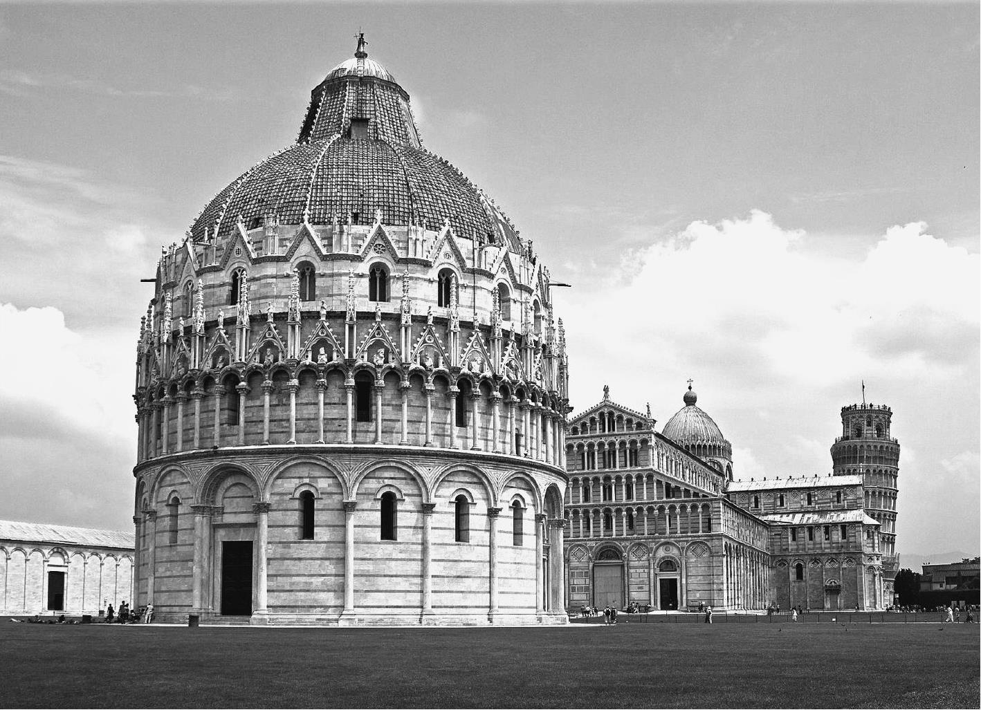 图4-14 比萨建筑群(1053—1272),三座建筑分别是:洗礼堂(前),大教堂(中),钟楼(后),其中洗礼堂的建造时间为1153—1363。