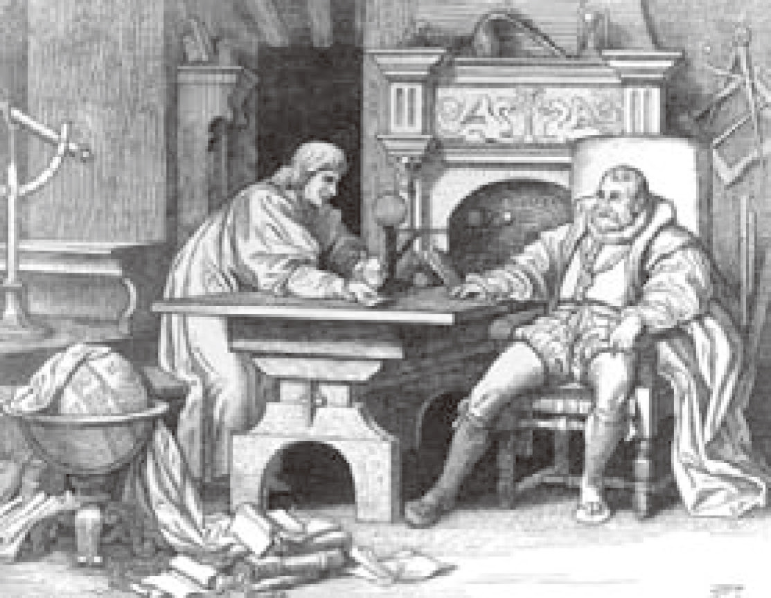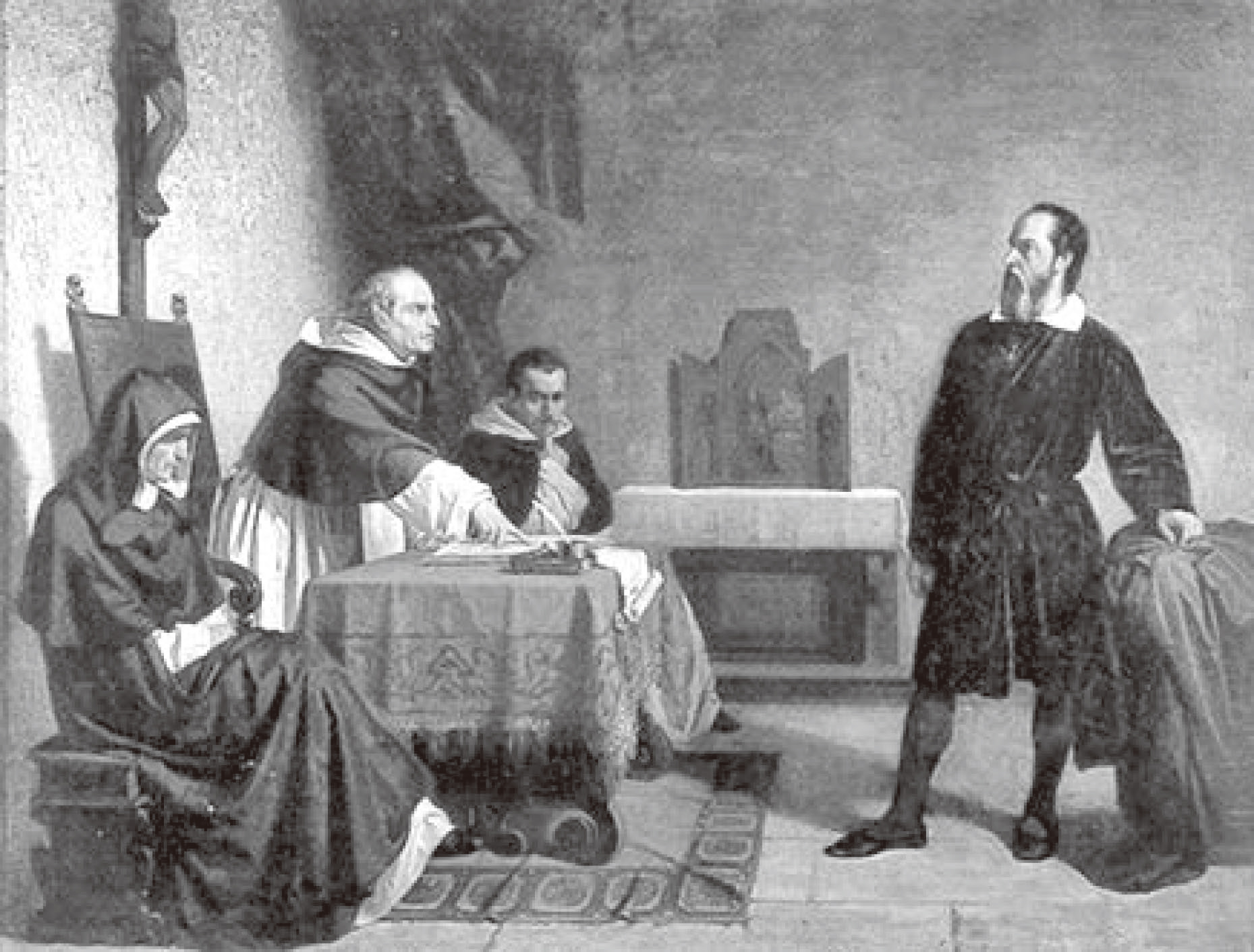 此图描绘的是1633年审判伽利略时的情景。(绘于1857年)
