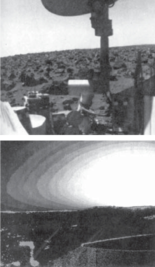 上图为美国发射的“海盗”2号探测器在火星上;下图为探测器拍下的火星上的日落景象。