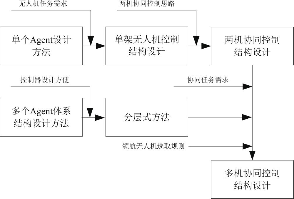 由于分层式结构逻辑清晰,便于控制器的设计,因此可以以分层式结构为基础,针对其缺陷提出一种相对参考点确定规则,并考虑协同作战任务需求,提出合适的多机协同控制结构。具体的设计思路如图2-3所示:先通过基于Agent的方法,在考虑单架无人机飞行控制的基础上进行无人机个体控制结构设计,然后进行两架无人机协同编队飞行控制结构设计,并采用MAS分层式体系结构思想,利用领航无人机选取规则,同时考虑多无人机协同作战任务需求,采用相应的方法扩展到多架无人机。