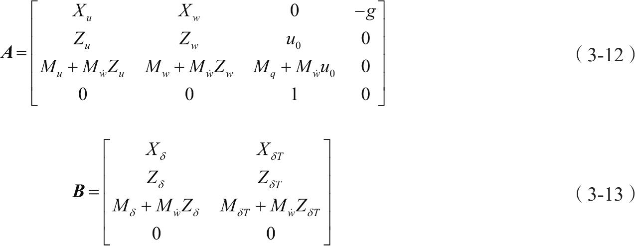 纵向线性化小扰动运动方程式的简化形式为: ẋ=Ax+Bη ,其中 x =[∆u ∆w ∆q ∆θ] T , η =[∆δ e ∆δ T ] T , x 为状态变量, η 为控制变量,矩阵 A 和 B 包含了飞机的有量纲的稳定性导数,如式(3-12)和式(3-13)。