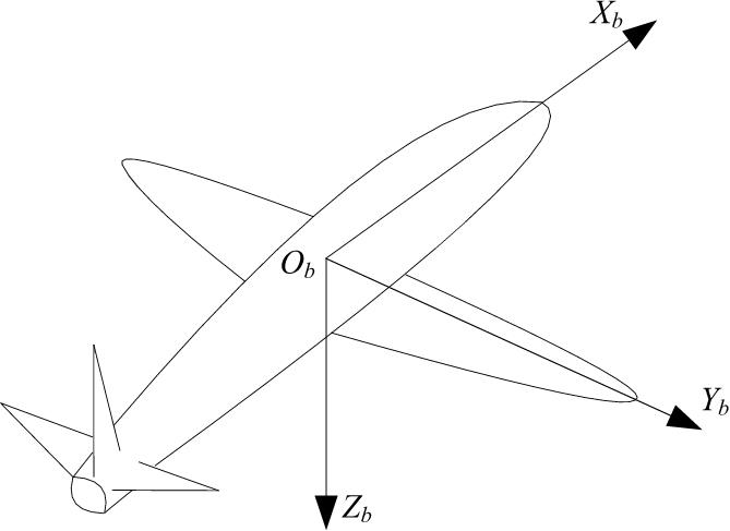 机体坐标轴系为S b –O b X b Y b Z b 。机体坐标轴系是与无人机固定相连的坐标系。原点O在无人机的重心上,X b 轴在无人机对称平面内平行于无人机的设计轴线并指向机头,Y b 轴垂直于无人机对称平面并指向机身右方,Z b 轴在无人机对称平面内,与X b 轴垂直并指向机身下方,如图3-2所示。机体坐标轴系主要用来描述无人机相对于该轴系的受力和运动关系。