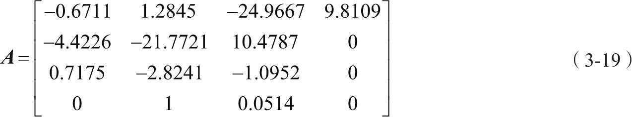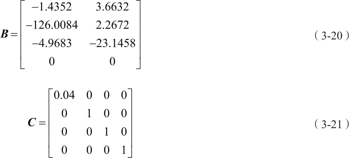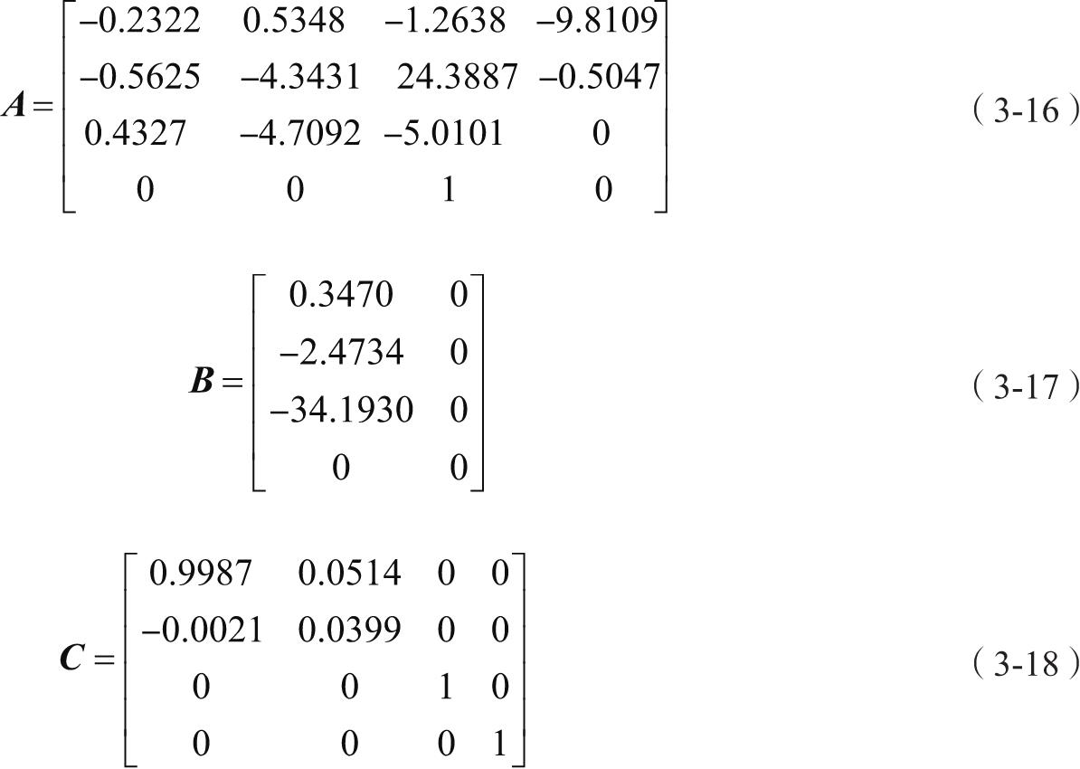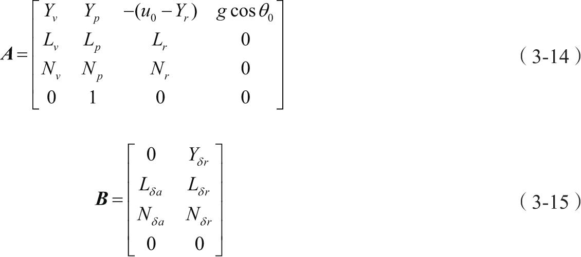 横向运动线性化方程为:状态方程 ẋ=Ax+Bη ,输出方程 y=Cẋ ,其中 x =[v p r φ] T , η =[δ a δ r ] T , y =[β p r φ] T ,得到式(3-19)、式(3-20)和式(3-21)。