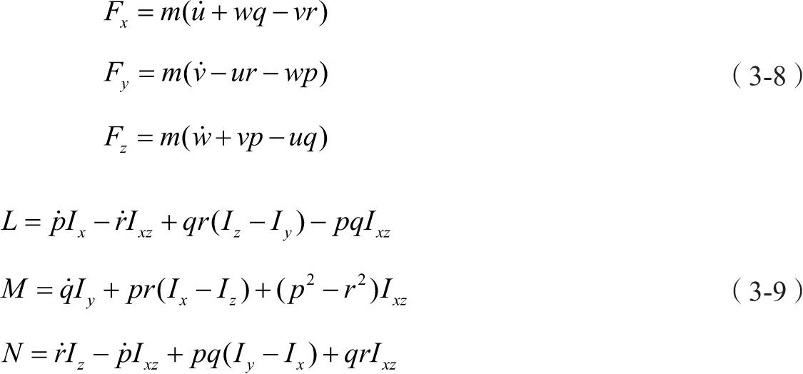 以机体坐标系为动坐标系,建立的动力学方程为式(3-8)和式(3-9)。