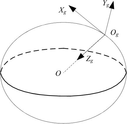 地面坐标轴系(地轴系)为S g –O g X g Y g Z g 。地面坐标轴系是相对于地面不动的坐标系。原点O固定在地面的某点,X g 轴在水平面内并指向某一方向,Z g 轴垂直于地面并指向地心,Y g 轴也在水平面内,并垂直于X g 轴,其指向按右手定则确定。一般在建立无人机运动方程时,忽略地球的旋转和曲率,把地面坐标轴系看成惯性坐标系,如图3-1所示。