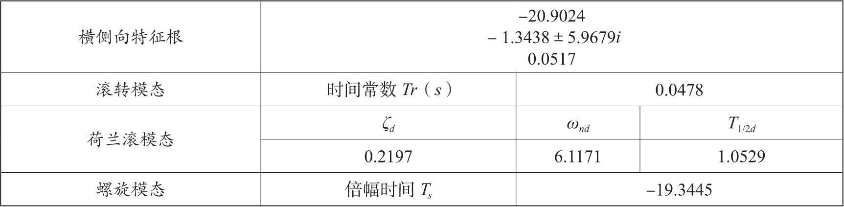 常规飞机的横向动态特性用4个典型的扰动运动模态来表示,大负根表示快速滚转运动模态,小根表示缓慢运动螺旋模态,一对共轭负根表示荷兰滚运动模态,横向基本特性如表3-2所示。