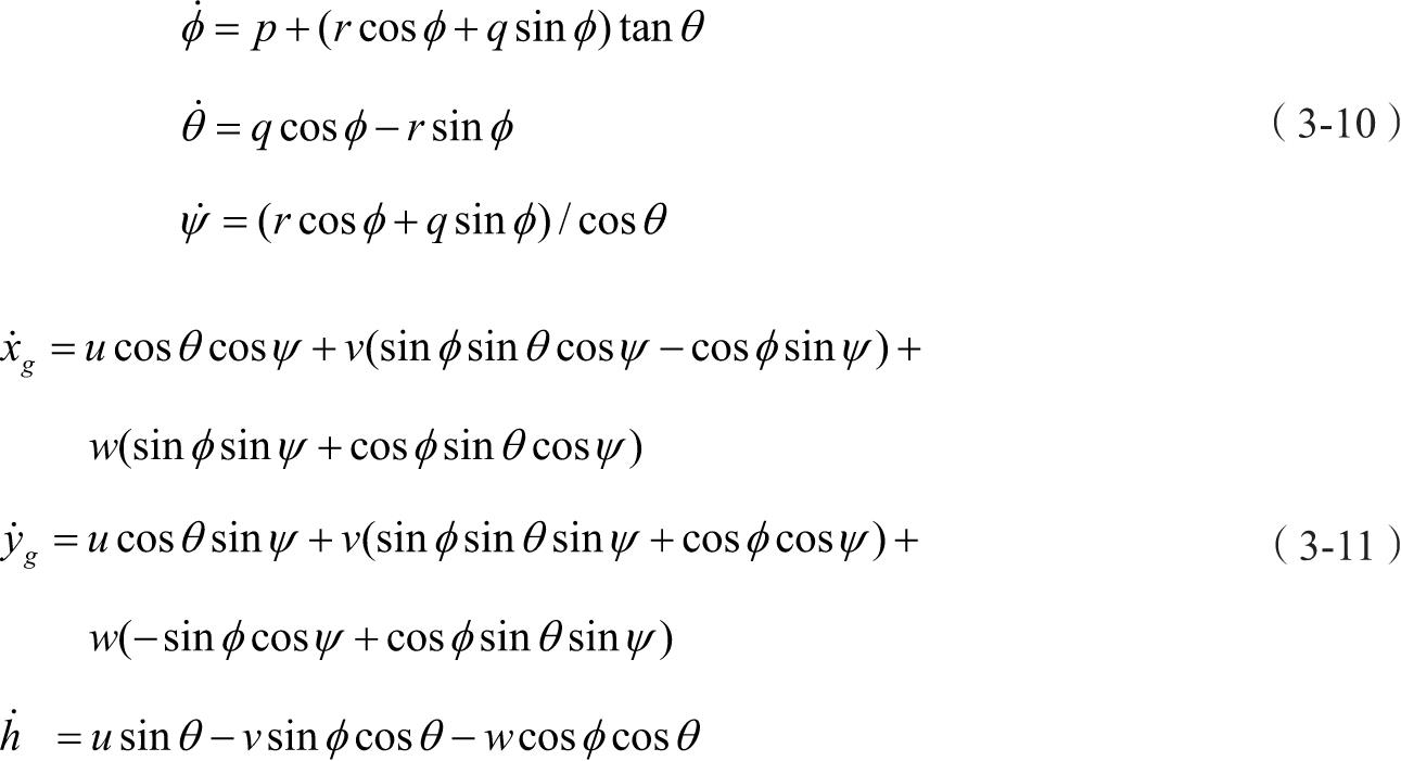 为了描述无人机相对于地面的运动,由动坐标系(机体坐标系)和地面坐标系之间的关系得到运动学方程式(3-10)和式(3-11)。