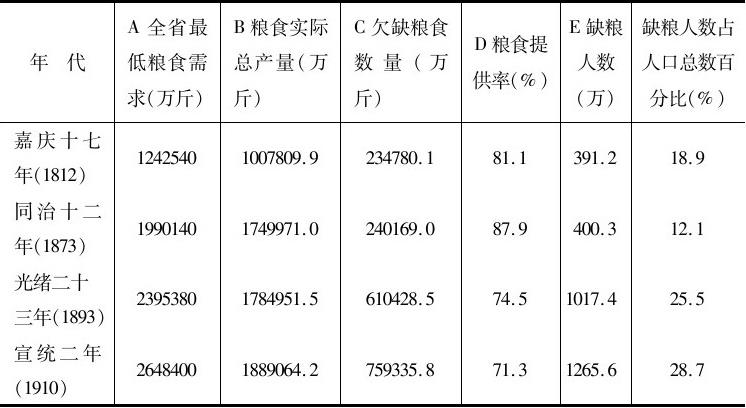 川省人口的大量增加,势必造成生计的困难,所以在清季的史料中诸如“生齿日繁”“生计日蹙”的记载屡见不鲜,生计问题成为社会不稳定的一个重要因素。前面已经指出,南方农民衣食住行每年至少需粮730斤,我们将这些标准降低到600斤,来看看嘉庆以后四川的粮食提供情况(见表2-35)。表2-35的估计尚未排除灾害、战乱、抛荒等种种影响粮食产量的因素,因此,实际情况往往要比表2-35所列糟糕得多。按我们的最高估计,同治年间的粮食提供率仅有88%左右,20世纪初仅71%左右。按最保守的计算,同治年间人口总数的12%,即约400万人没有基本生活保障;20世纪初,人口总数的约29%,即1200多万人缺乏粮食。粮食如此短缺,我们认为,这就是当时社会混乱最根本的动因。