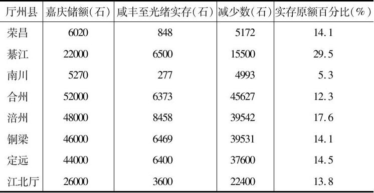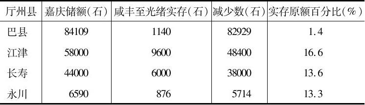 资料来源:嘉庆储额见嘉庆《四川通志》卷72,《食货·仓储》。光绪实存见四川大学历史系藏巴县档案抄件,光绪朝内政卷和财经卷。