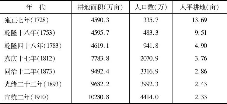 资料来源:耕地面积见本章表2-23、2-25、2-26。乾隆四十八年数用四十九年数代。人口数见本章表2-10、2-12、2-18。