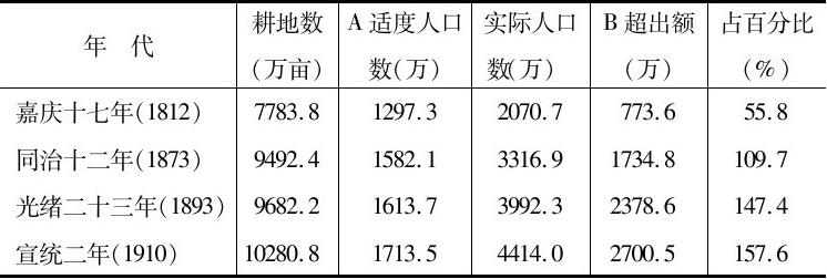 物质资料的生产和人类自身的生产是相互依存、相互制约的两种生产,这种紧密的联系使两种生产在客观上有一定的比例。人口生产与物质资料的增长相适应,这就是我们所追求的“适度人口”。对以农业生产为主的四川传统社会来说,其适度人口即应是人口规模不超过农业资源及其提供食物的能力。按洪亮吉的推算,从最低生活标准(4亩)要达到中等生活程度,耕地要扩大1.5倍(即10亩)。考虑到清末亩产有所提高,我们且按人均6亩计算近代四川的适度人口(见表2-34)。19世纪初川省适度人口为1300万左右,19世纪末为1600万左右,20世纪初为1700万左右。但19世纪初实际人口数超过适度人口700多万,中期超过1000多万,20世纪初超过2000多万,多出人口达150-160%。因此,即使我们撇开统治机器的压榨或天灾人祸的影响,人民生活的恶化都是不可避免的。