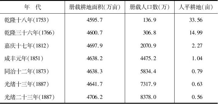 资料来源:耕地数见表2-23,其中乾隆三十六年用乾隆三十一年代替。人口数见表2-12、2-13、2-18和严中平等:《中国近代经济史统计资料选辑》附录“清代乾隆、嘉、道、咸、同、光六朝人口统计表”。