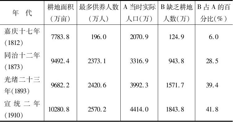 到嘉庆中期川省耕地已显不足,6%的人口缺乏耕地,但能勉强维持,然随人口增长情况日益恶化。同治时期900多万人、即人口总数的约29%缺乏耕地,到清末缺地人数发展到1800万人,占人口总数的42%。川省人口与耕地的比例失调到嘉庆中期便已到临界点,自此以后,耕地面积增长远低于人口增长,两者呈现的“剪刀差”愈大,社会经济负载愈重,亦预示着社会危机的日趋加深。