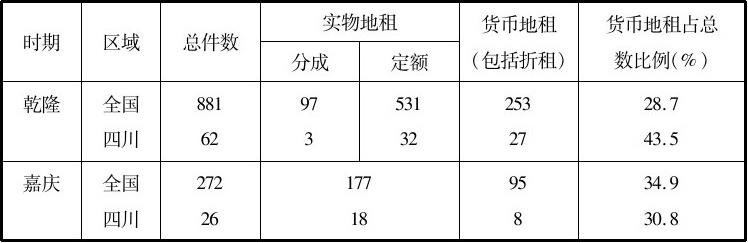 。据清刑部档案记载,乾嘉时期货币地租在整个地租形态中已占有相当的比重,见表3-3。从乾隆时期看,川省货币地租的比例大大超过全国,达到43.5%;嘉庆时期略低于全国。如果去掉某些资料的或然性,划定乾嘉时期上游货币地租达到30%似乎是不成问题的。一般来讲,货币地租在经济作物区要多一些,而粮食作物区要少一些。