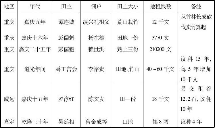 据巴县档案关于重庆租佃关系的记载:乾隆三十八年朱世俊佃朱仕良田土,押佃13千文;李如海佃张泽普一分田地,议定押租钱1000文;道光十六年何应荣佃郭文秀田业,押佃银500两;十七年钟声泰佃谢广发田土,押佃银80两;二十三年李长泰佃罗义盛田土,押佃银360两