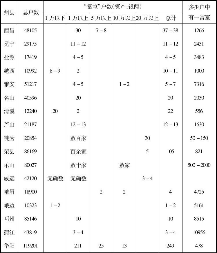 从统计看,所谓“富室”在农村中所占比例并不高,一般1000—4000户才有一户,蒲江1万多户才有“富室”一家。然而也有例外,如华阳平均478户就有“富室”一家,显然,城市是富室聚居的地方,所以比例甚高。另外,一些商品经济程度较高的州县,如产盐糖的荣县、犍为等富室也稍多。但是从总体上看,对清末农民的分化程度不宜作过高估计。