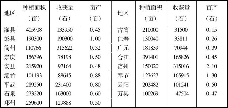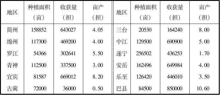 17个州县中种植面积以灌县为最大,达到40.5万亩;其次是合江,为39万亩;另外安县、平武、石泉、邛州、古蔺、云阳等都在20万亩以上。从总产量看,以简州和涪州最高,为31.5万石;其次是平武,为23万石;彭县19万石,石泉和奉节16万石,邛州13万石,此外崇庆、安县、绵竹、广元、云阳总产都在5万石以上。从平均亩产看,以涪州最高,为2.1石;其次是奉节,为1.3石;彭县为1石。而亩产低的古蔺、仁寿等地不过0.1-0.2石。据统计,全川1910年共栽种包谷687万亩,总产量1037.5万石