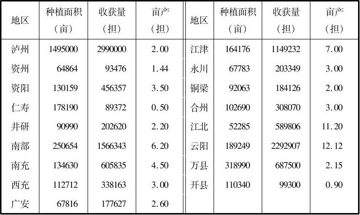 在表列29个厅州县中,种植10万亩以上的有简州、绵州、青神、泸州、资阳、仁寿、南部、南充、西充、中江、遂宁、安岳、乐至、江津、合州、云阳、万县、开县等18州县,其中以泸州为最多,达到149.5万亩;万县次之,为31.9万亩;遂宁、南部再次之,为25万亩。总产量亦是泸州最高,为299万担;其次是云阳,为229.3万担;再次是南部、江津、犍为,分别有156.6万担、114.9万担和111.3万担。年产番薯50万担以上的还有简州、宜宾、南充、中江、安岳、巴县、江北、万县等厅州县。从亩产量看,高者有江北、巴县等,达10担以上;低者有古蔺、仁寿等,不足1担。据统计1910年全川共栽番薯605万亩,总产量3950.6万担