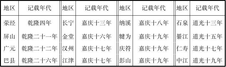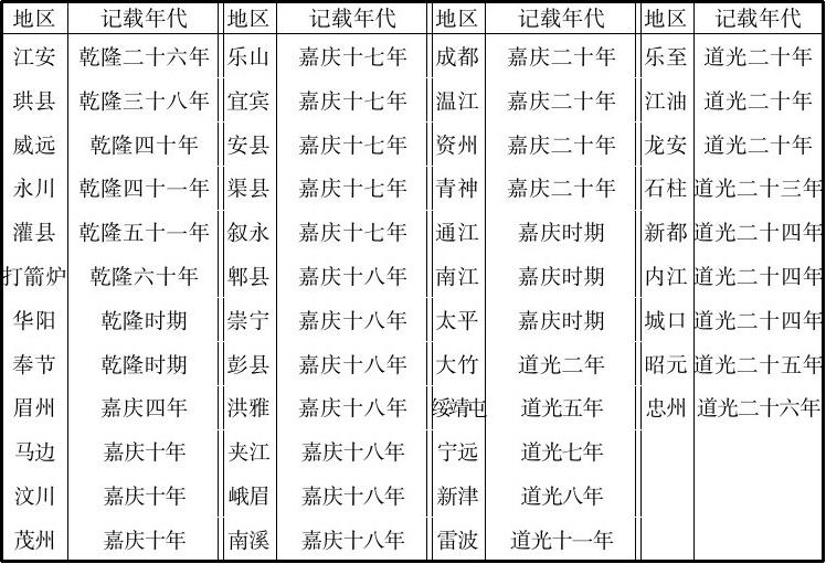 从乾隆到道光年间,上游各厅州县已知的引种玉米的最早记载见表3-8。迄道光二十六年(1846)玉米种植见于记载的厅州县已有61个。