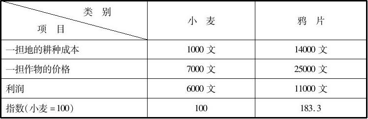 农民大量种植鸦片原因是它的利润甚高,而且在人口增多、人均耕地减少的情况下,鸦片在旱地种植,不占水田,加强了单位面积土地的利用。表3-11是小麦和鸦片栽种的成本和利润比较。
