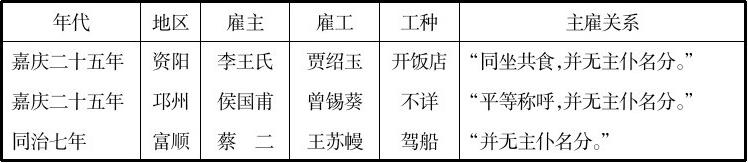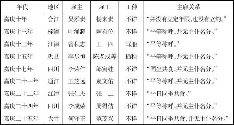 清代上游雇工流动较为普遍,川人出省和外人入川佣工同时存在,区域内部各地客籍雇工亦属不少。这些雇工长期流寓外地,说明他们基本上脱离了家庭的束缚,而且与土地发生了分离,他们可以自由出卖自己的劳动力。关于雇工能够自由出卖劳动力的情况,表3-12即是很好的说明。黄冕堂在《略论清代农业雇工的性质与农业资本主义的萌芽》一文中,以乾嘉两朝的刑科题本为主列出了《清代“无主仆名分”雇工简表》,全表共49例,四川即有12例,占总数的24%,这说明川省的自由雇工较之他省更为普遍。主雇之间都“无主仆名分”,人身依附关系基本上不存在了,他们有选择雇主和来去的自由。农业佣工名目繁多,有长工、短工、忙工、年工、季工、月工、日工等各种形式,在商业性农业生产中起着很大的作用。