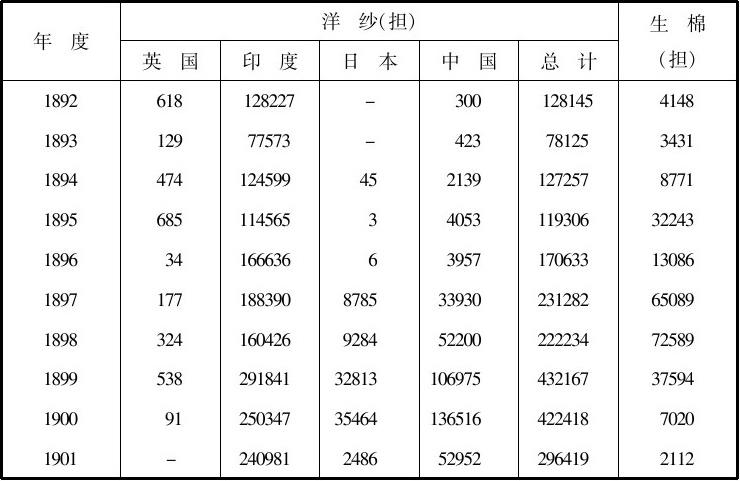 ,当然这并没造成对自然经济的较大动摇,而继洋布之后涌入的洋纱却使自然经济受到了根本打击。表3-13列出了1892—1901年的历年洋纱输入情况。