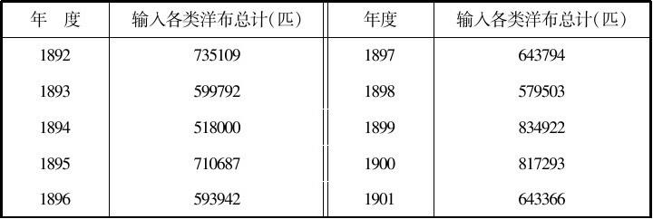 1901年洋布输入较之1892年减少14%,输入最高年份1899年也不过834922匹,尚未达到1880年代水平。这种情形的出现,是由于洋布仅有各大城市的少数居民才使用,“几乎只有富裕户购买”,而广大农村人们“继续穿着保暖耐用的土布”