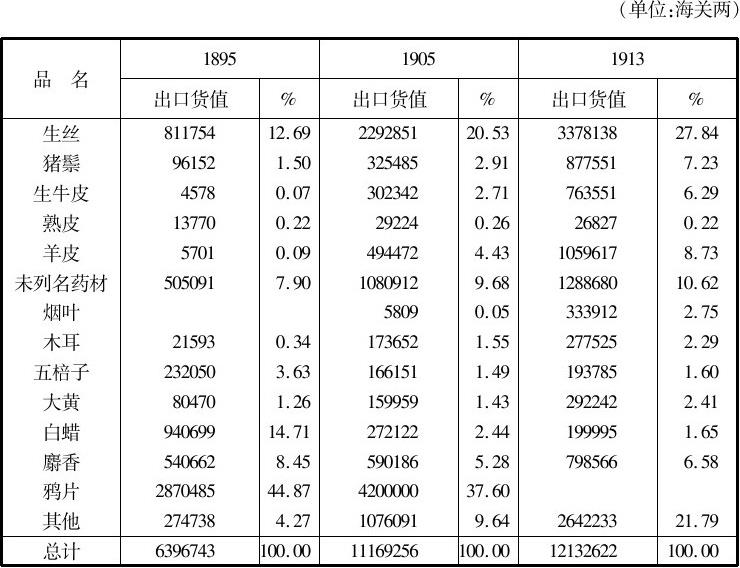 从总体上考察,19世纪末上游农产品商品化速度有所加快,这从主要出口农副产品的数额上体现出来,表3-15是1895—1913年四川主要出口农副产品的情况比较。从1895年至1913年,12种主要农副产品的出口值增长32.92倍,其中以适应外国市场需要的生丝、猪鬃、牛皮、羊皮、烟叶、大黄等增长最为迅速,如生丝增长4.16倍,猪鬃9.13倍,烟叶57.48倍,牛皮167倍,羊皮186倍。这五种商品在出口总值中所占比重也从1895年的15.51%增至1913年的55.25%。而以国内贸易为主的其他6种农副产品,除熟皮、药材、木耳、麝香有少量增长外,白蜡和五棓子的出口值都分别下降了78.74%和16.49%