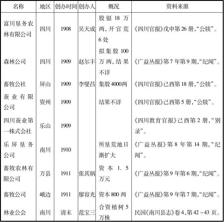 。1910年合州石塘刘寅阶等集股试办溥利公司,在小沔溪、滩子坝、三汇坝等处租放山蚕4万种,在水里、铜溪镇、费家渡等租放山蚕1万种,预计“其收茧成绩最好”。据不完全统计,迄1911年上游地区设立及筹办的农业公司有十余家,见表3-19。