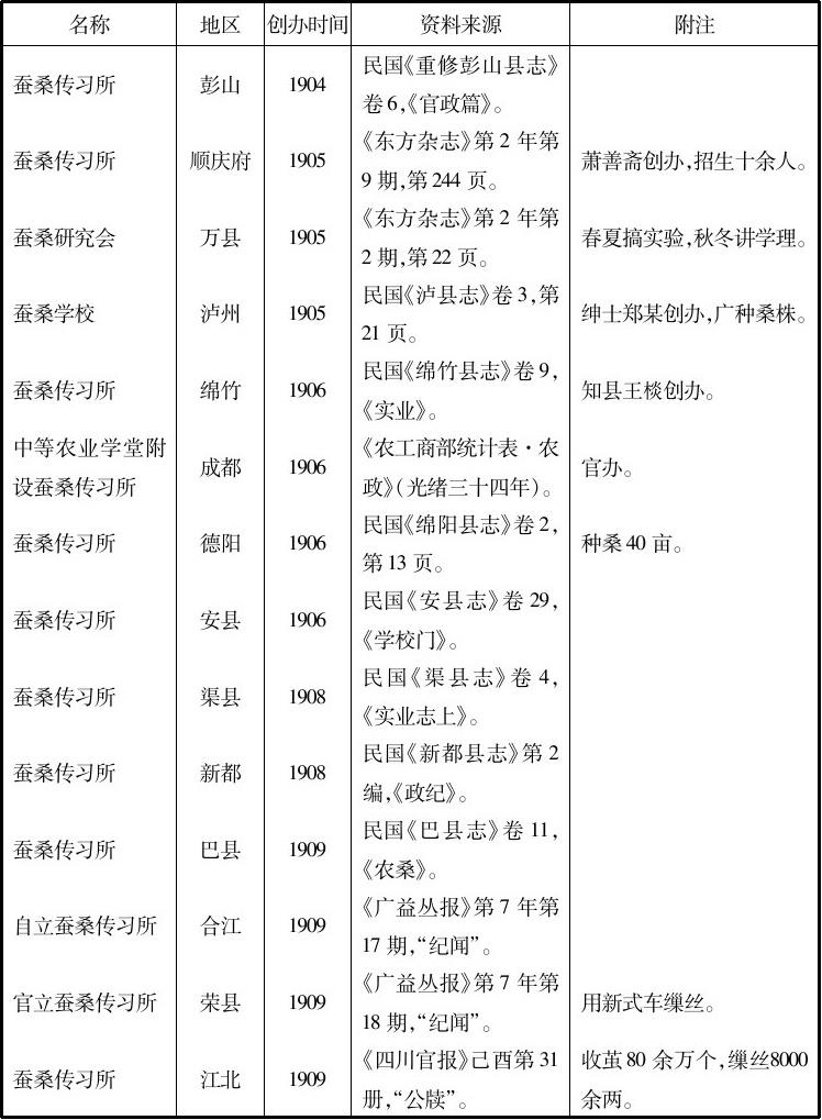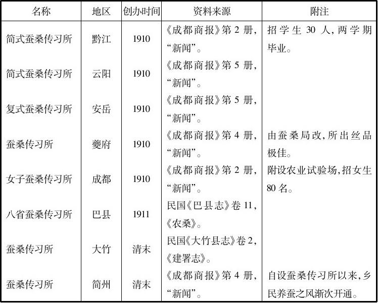 在蚕桑公社出现的同时,蚕桑传习所更是大量建立。1906年四川农政局在中等农业学堂附设蚕桑速成科传习所,讲授“栽桑、养蚕、制丝诸法”。招生40人,一年毕业。传习所力图使学员“深明种植、饲育、缫丝,学成而后,归而教其一乡一邑,或自谋蚕桑事业”