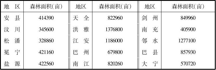 据1910年对川省森林面积的统计,35个州县森林面积在10万亩以上,表3-26是森林面积30万亩以上地区的统计。从表可知,30万亩以上州县共15个,其中江安118.6万亩,洪雅137.6万亩。川省共计森林面积1599万亩