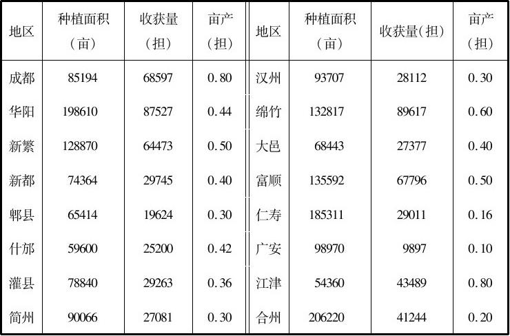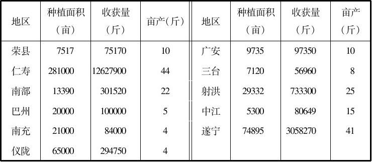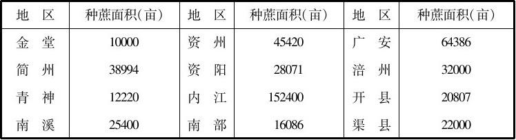 甘蔗:种植区域有很大发展,面积进一步扩大,由清中前期的少数地区发展到97个州县,其中金堂、简州、资州、资阳、内江等12个州县都在万亩以上,一些主要种蔗区面积见表3-24。种植面积较大的地区主要分布在沱江流域,如资州、资阳、内江等,其中内江高达15.2万亩。1910年全川种蔗50万亩左右