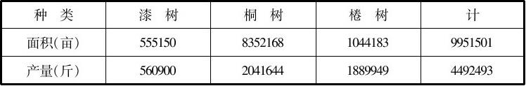 。表3-23是1910年统计的全川漆、桐、棬树的种植面积和收获量。三种经济作物种植面积达995万亩,收获总量449万斤,其中漆树55.5万亩,收获56.1万斤;桐树835.2万亩,收获204万斤;棬树104.4万亩,收获189万斤。
