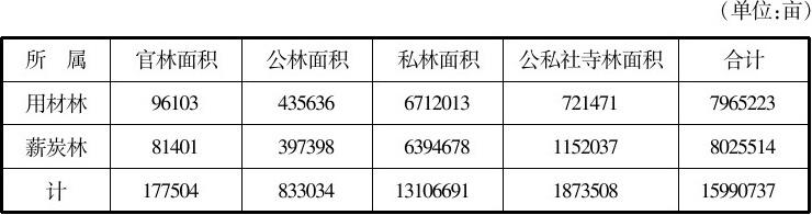 在1599万亩中,用材林796.5万亩,占49.8%;薪炭林802.6万亩,占50.2%。全部森林中,私林1310.6万亩,占82%,其余分别为官林、公林、村社和寺庙所有。