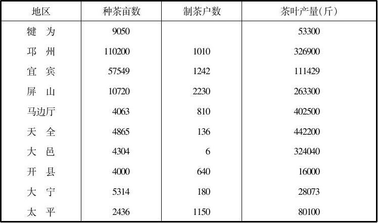 在改良茶叶制作的同时,扩大了茶叶的种植面积,如崇庆、荥经、邛州、宜宾、屏山等地种植面积都在万亩以上,表3-21是1910年部分地区种茶及产量情况。