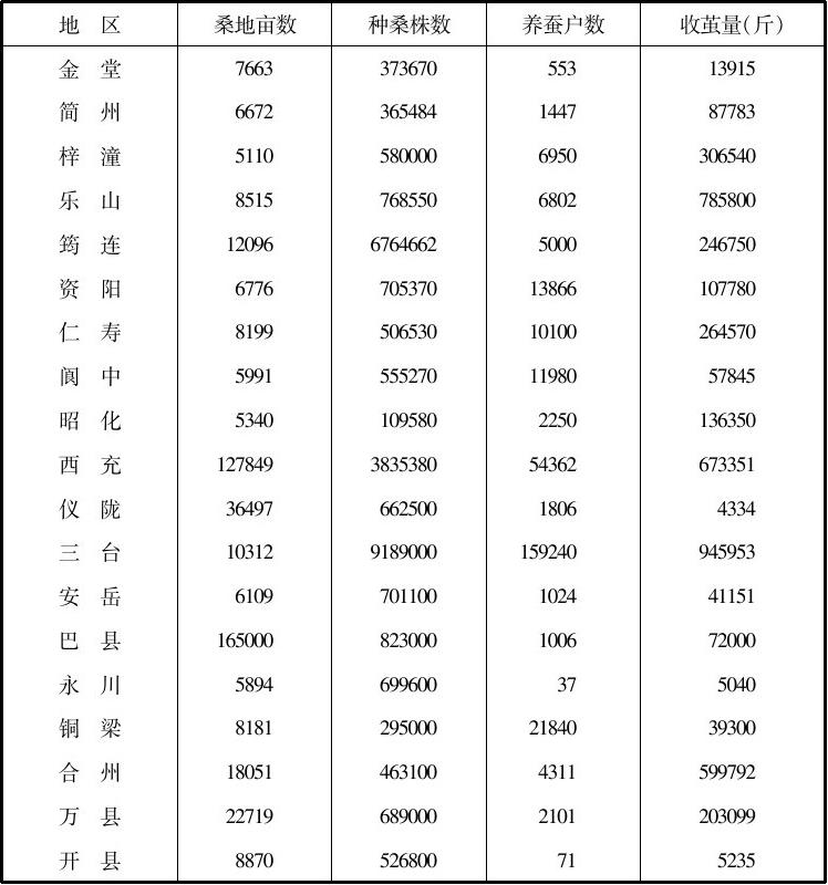 。当时蚕桑业比较发达的有简州、梓潼、筠连、阆中、西充、三台、巴县等,这些地区植桑面积都在5000亩以上,有的多达万亩,表3-20列出了一些蚕桑较发达的地区状况,反映了蚕桑业发展的大概情形。三台、万县、筠连种桑都在万亩上下,最多的是西充和巴县,分别种桑12.9万亩和16.5万亩;从种桑株数来看,以筠连和三台为最,分别达到676万株和918.9万株;从养蚕户数来看,资阳、仁寿、阆中、西充、三台、铜梁都在万户以上,其中西充达到5.4万户,三台15.9万户;从收茧量看,以乐山、西充、三台、合州等为多,皆在50万斤以上,其中合州近60万斤,西充67万斤,乐山78万斤,三台更达到94.6万斤。从上可见,三台蚕桑业可称为全域之冠。