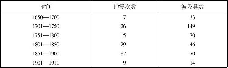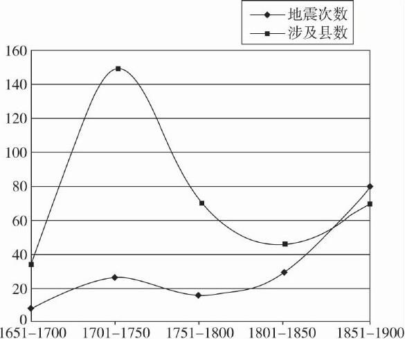 。据不完全统计,清代260余年间上游共发生大小地震169次,平均约1.5年一次,可见上游是一个地震频繁的地区,其时间分布见表1-7,并做出图1-2。从表和图看,清后期地震较前期频繁,其中以1851—1900年间次数最多,平均每年1.6次。但从波及的地区来看,1701—1750年达到149个州县。有些地震造成了很大的破坏。