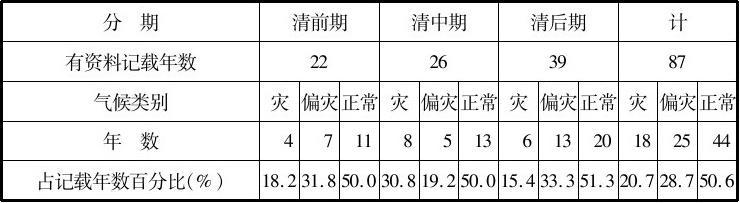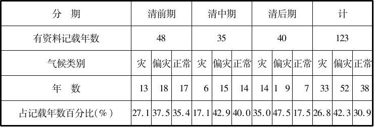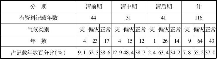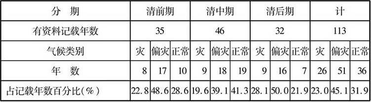 第二,川东。从川东有记载的113年看,气候正常的时间36年,占31.9%,较川北稍好。与川北不同的是旱灾多于涝灾,旱和偏旱占39年,达34.5%。受灾年比例较川北低,为23%。从整个清代来看,仍以中期为好,受灾不到20%,前期和后期受灾在23%左右。