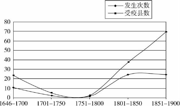 。关于清代四川瘟疫概况,我们根据《四川疫情年表》,大概以每50年划段,整理出清代四川瘟疫出现的趋势和规律,见表1-6。根据表1-6,绘出图1-1。