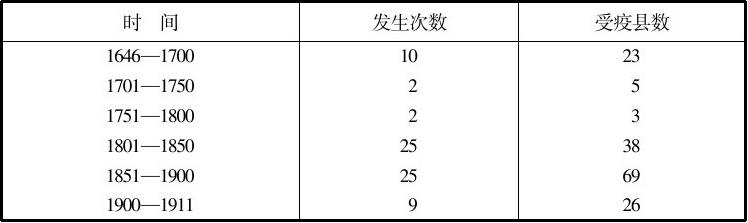 瘟疫的出现,既有自然的原因,亦有人为的因素。从图1-1中,我们似乎可以指出以下几点:1.清初,由于战乱和社会的不安定,瘟疫出现率较高;2.康雍乾时期,社会生活相对稳定,因而瘟疫的出现也呈下降的趋势;3.进入近代以后,阶级矛盾激化,社会动荡,因而瘟疫的出现又呈持续上升的势头。