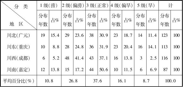 第四,川南。正常气候在有记载的87年中占50.6%,灾年占20.7%,好于川北;川东但差于川西。该区也是涝多于旱,涝和偏涝27年,占31%,旱和偏旱16次,仅占18.4%。从时期看,同川西一样亦是清后期为好,受灾年占15.4%,中期最差,受灾年占30.8%。