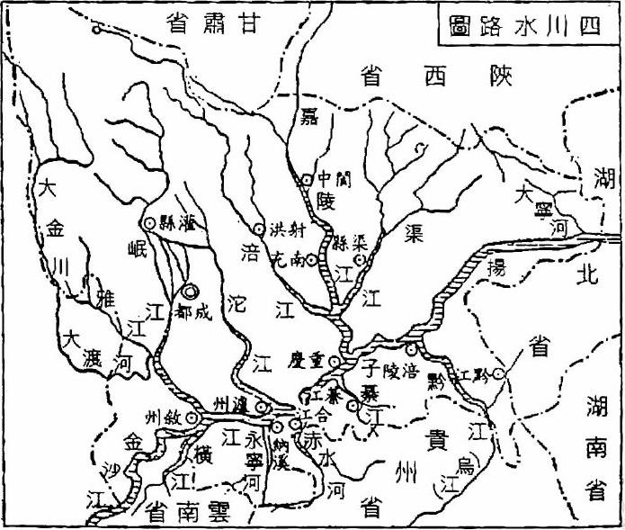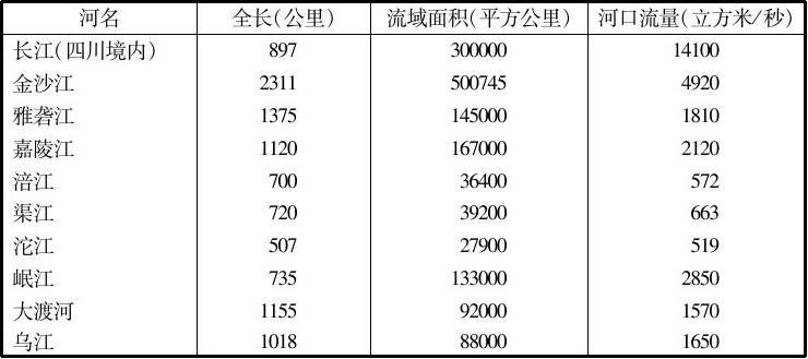 长江上游地区的交通运输以长江及支流木船航运为脉络,与此相联系的是散布在城乡各地的石板小路。长江为主干河流,全域众水归流,汇集于长江,形成一个天然而完整的水道交通网。全川共有大小河流540条,总长4.4万公里,其中通航河流90余条。全川河流除川西北的白河、黑河及达拉沟三条小河北流入黄河外,其他如雅砻江、岷江、沱江、嘉陵江、涪江、渠江、乌江等7大主要河流以及綦江、赤水河、永宁河、大宁河等均属长江水系。表1-8是各水系流域面积及流量。下面是各流域的简要叙述(参见图1-3)。