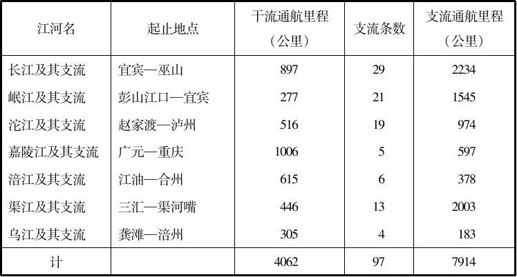 为更清楚了解上游内河航运状态,兹将各种资料编成表1-9。七大干流通航里程4062公里,支流达97条,通航里程达7914公里,干支流相加计11976公里,可见川省具有利用水运的巨大潜力。