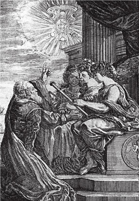 ▲颂扬伽利略的寓意画:他敬重数学、光学和天文学,把望远镜献给代表这三项科学的人物。